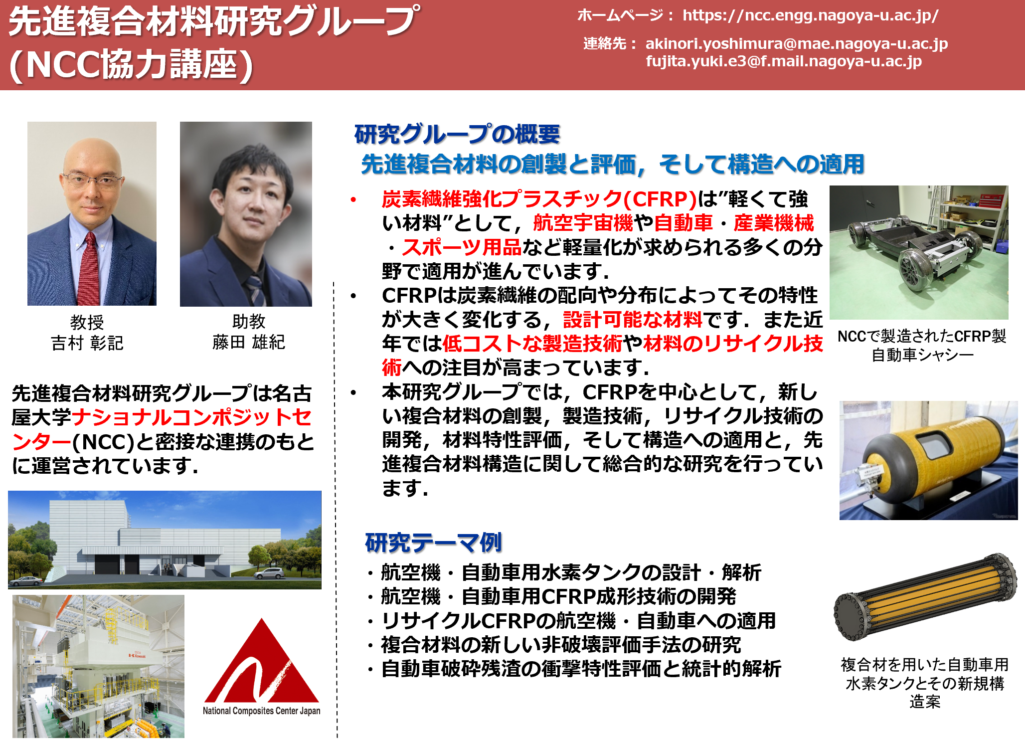 研究はこれまでなかったもの,ことを作り出したり,わからなかったことを解明したりする,とても楽しく,価値ある営為だと思っています.私達の研究によって複合材料の航空宇宙,自動車構造への適用を少しでも進展させ,世界をより良く,皆をハッピーにしていくことが最終目標です.また,NCCの産業連携研究を通じて,学生や企業の方々の人材育成を進め,日本に複合材料のわかる人材をもっともっと増やしていきたいと思っています.